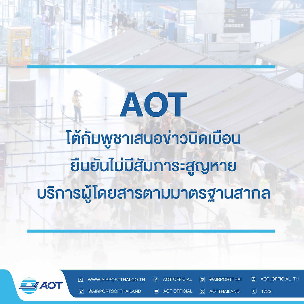 จากกรณีที่สื่อมวลชนของประเทศกัมพูชาได้เผยแพร่ข้อมูลบิดเบือน เมื่อวันที่ 18 ธันวาคม 2568 ว่า สถานเอกอัครราชทูตกัมพูชาประจำประเทศฝรั่งเศสได้ออกคำเตือนเกี่ยวกับการเดินทางไปยังกัมพูชา โดยมีการเดินทางต่อเครื่องที่สนามบินในกรุงเทพมหานคร (ประเทศไทย) ซึ่งระบุว่าผู้โดยสารชาวยุโรปที่เดินทางต่อเครื่องถูกตรวจสอบอย่างเข้มงวดและไม่เหมาะสม อาทิ การสอบถามเป็นเวลานานก่อนขึ้นเครื่อง การขอหลักฐานแสดงฐานะการเงินที่ไม่สมเหตุสมผล การตรวจสอบรายละเอียดการจองที่พักในกัมพูชาอย่างละเอียด และสัมภาระของผู้โดยสารสูญหายนั้น บริษัท ท่าอากาศยานไทย จำกัด (มหาชน) (AOT) ขอยืนยันว่าประเด็นที่กล่าวอ้างตามข่าวนั้นไม่เป็นความจริง